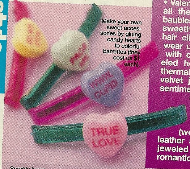 The green "page me" heart looks so dated. There is a major flaw with this craft. It uses real candy hearts. There are a lot of problems with this. Candy hearts crush easily. It doesn't say to use any type of sealer or something. Wouldn't that make the craft prone to vermin?Then I found this craft. It's a conversation hearts bracelet, but the hearts are made of clay. If those two projects are combined together the candy won't get vermin. These ones are covered in resin.